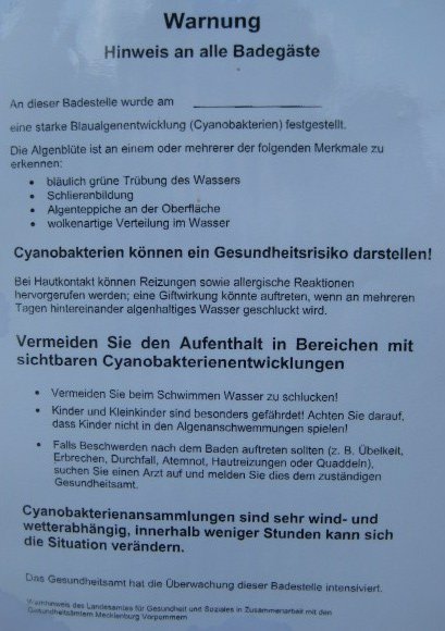 Nachdem sich die Wetterlage in dieser Woche etwas entspannt hat, ist das direkte Badeverbot vom letzten Sonntag aufgehoben und durch ein Gebot ersetzt worden: Das Landesamt für Gesundheit und Soziales ruft in Zusammenarbeit mit den Gesundheitsämtern dazu auf, den Aufenthalt in Bereichen mit sichtbaren Cyanobakterienentwicklungen zu vermeiden. Die mittlerweile aufgestellten Hinweistafeln besagen insbesondere: