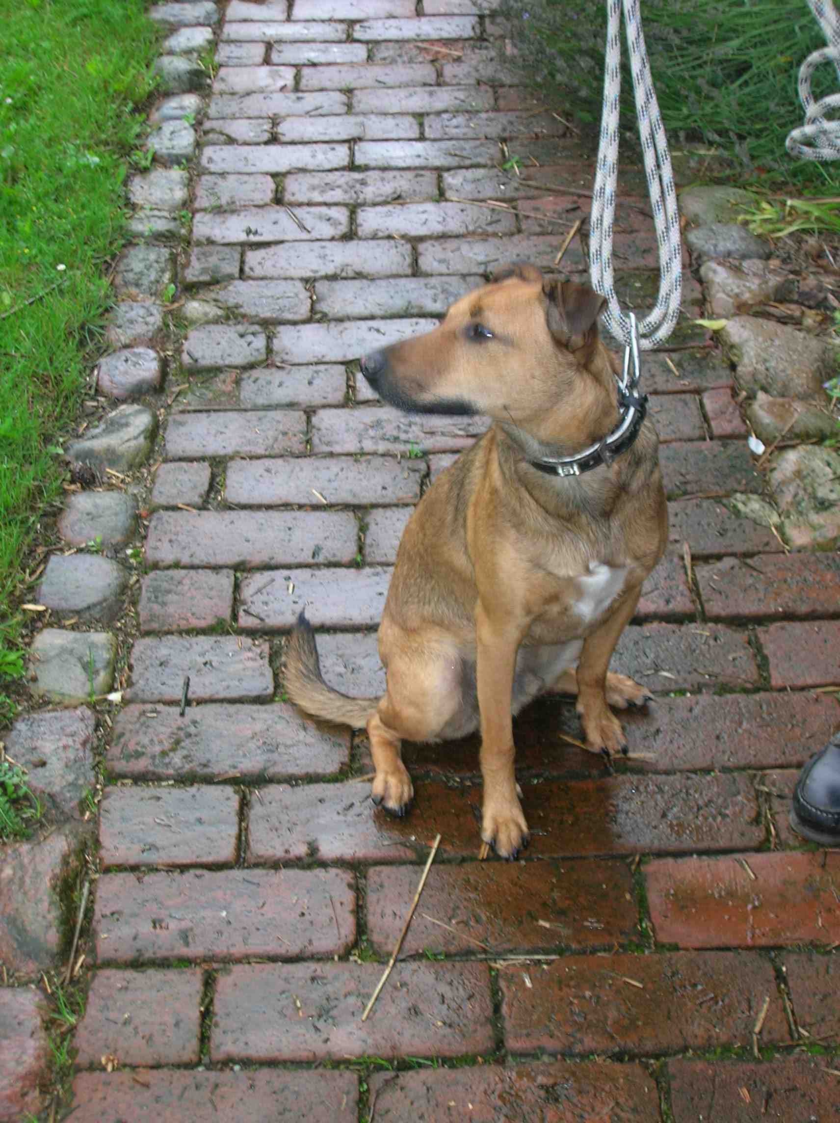 Der Hund ist erzogen, hört auf Kommandos wie "Sitz!" Es ist ein Mischlingsrüde, dem Gebiß nach etwa 1-2 Jahre alt. Er trägt ein Halsband, das offensichtlich nicht für ihn gekauft wurde (wurde enger gemacht). Das Halsband ist schwarz, besetzt mit Zierglassteinen (Svarowski). Das spricht dagegen, dass der Hund ausgesetzt wurde - wahrscheinlicher ist, dass er entlaufen ist und vom Besitzer nicht wiedergefunden wurde. Sicher ist das aber nicht.