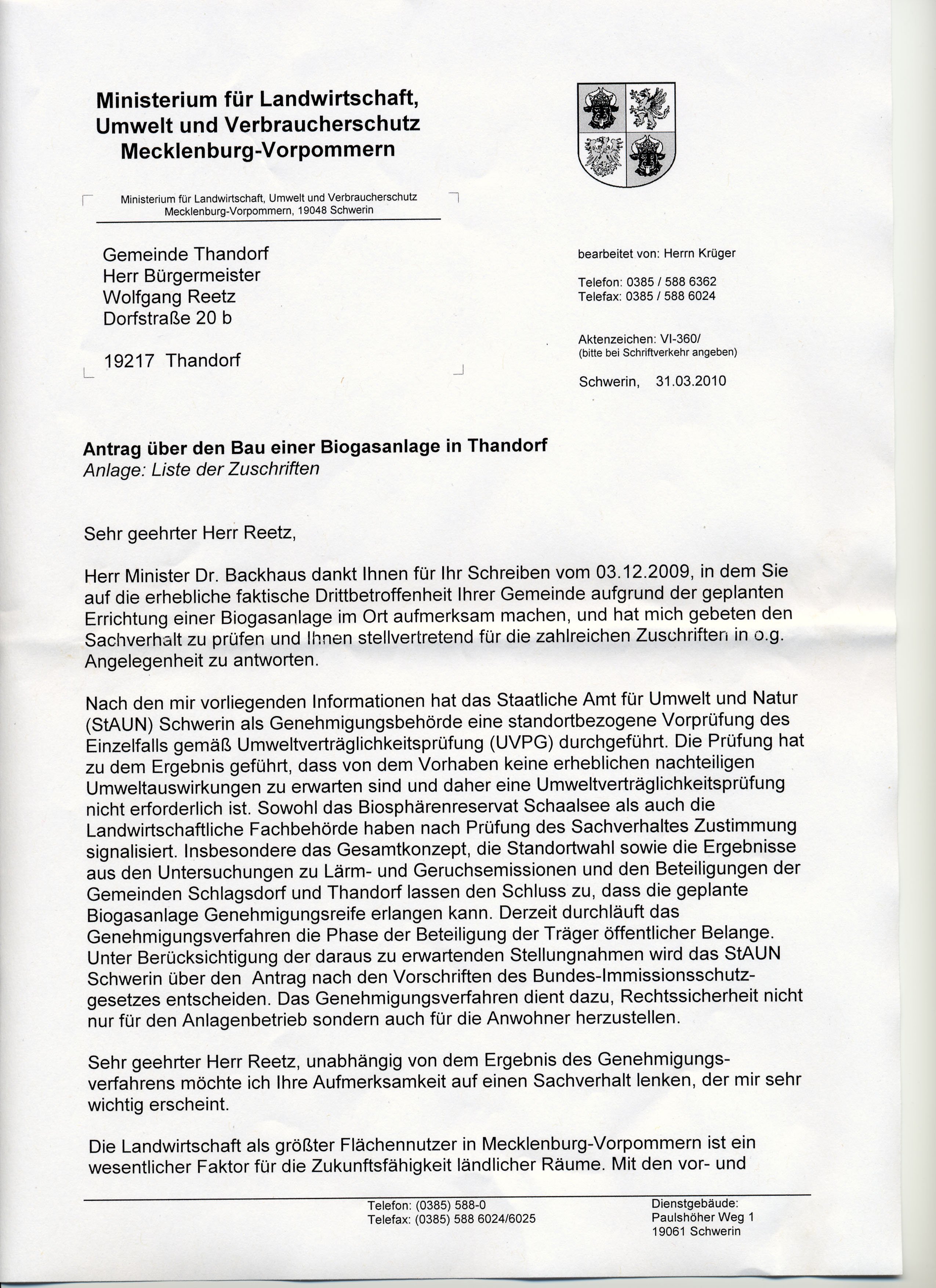 Heute hat das Ministerium im Namen des Ministers Stellung genommen zu den Briefen der Thandorfer.