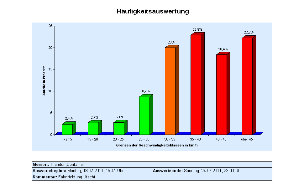 Auf Höhe der Altglascontainer in der Mitte des Dorfes wird Autofahrern in Richtung Utecht nicht nur ihre Geschwindigkeit angezeigt. Die Meßtafel führt darüber hinaus auch eine Statistik über die Zahl der Verkehrsteilnehmer und die jeweilige Tempomessung in dieser Fahrtrichtung. Diese Statistik macht die Gemeinde jetzt zum ersten Mal öffentlich, exemplarisch für die Zeit vom 18.7. bis 31.7. In diesem Zeitraum passierten insgesamt 4467 Fahrzeuge das Meßgerät, also ca. 320 am Tag oder über 2000 jede Woche. Darin ist der Gegenverkehr nicht einmal enthalten. Auch die Tatsache, dass derzeit Ferien sind, bleibt hier außen vor. Bei der Kreisstraße 5 handelt es sich um einen bei Pendlern beliebten Weg aus dem Nordwesten des Landkreises nach Lübeck und zurück. Dies zeigt sich vor allem an den gemessenen Verkehrsspitzen zur Berufsverkehrszeit. Morgens gegen 7.00 Uhr passieren an Werktagen um die 40 Kraftfahrzeuge pro Stunde den Meßpunkt. Hier kann man davon ausgehen, dass es sich um Pendlerverkehr handelt, der später am Tag auch wieder zurückfließt und so den Ort in Gegenrichtung ein zweites Mal passiert. An Wochenenden liegt der Schwerpunkt verständlicherweise eher gegen Nachmittag. Samstags und Sonntags wurden gegen 15.00 mehr als 30 Fahrzeuge pro Stunde gezählt. Interessant ist das Fahrverhalten der Verkehrsteilnehmer: etwa jeder fünfte hält sich an die Tempo-30-Regelung, die an dieser Stelle vorgegeben ist. Über 20% fahren bis zu 35 Km/h und bewegen sich damit noch gerade so eben in der Toleranzzone, in der noch keine Ordnungsgelder verlangt werden könnten. Fast 2/5 aller Fahrer (ca. 40%) halten offenbar ein Tempo zwischen 35 und 45 Km/h für angemessen und mehr als 20% finden sogar über 45Km/h in Ordnung. Dabei ist hier ein Schulweg deutlich ausgeschildert. In Thandorf gibt es außerdem zwei recht unübersichtliche Kurven, hinter denen Hofeinfahrten liegen und hinter denen Fußgänger die Straße queren. Auch der Abzweig nach Rieps und Schlagsülsdorf ist für Fahrer, die aus Richtung Utecht kommend die K5 verlassen wollen, besonders bei Gegenverkehr nicht ungefährlich. Trotzdem sind in Thandorf rund drei von fünf Kraftfahrzeugen deutlich zu schnell unterwegs. Genau genommen sogar vier von fünf, wenn man diejenigen mitrechnet, die zwischen 30 und 35 Km/h fahren und damit zwar nur gerade eben, aber eben auch zu schnell sind. Kaum eine Stunde vergeht, in der nicht auch deutlich über 50 Km/h gemessen werden. Sieht man sich die letzten beiden der hier gezeigten Grafiken an, so zeigt sich: die Spitzengeschwindigkeit im Durchschnitt liegt bei ca. 60 Km/h, also etwa dem Doppelten dessen, was erlaubt wäre. Auch die durchschnittlichen Geschwindigkeiten sind mit über 40 Km/h deutlich zu hoch. Bedenkt man, daß zur Zeit der Verkehrsspitze - werktäglich morgens gegen 7.00 Uhr - hier auch der Schulbus durchfährt und gerade dann der Weg entlang der K5 zum Bus auch von Schulkindern zu Fuß genutzt wird, dann gelangt man schon recht schnell zu der Frage, wie die Ordnungsbehörde des Landkreises zu ihrer Einschätzung gelangt, hier läge kein Gefährdungspotential vor. (siehe SVZ vom 30. Juli, Seite 15) Selbst wenn man die Spitzenmessungen von bis zu 87 Km/h ignoriert, die eher an späteren Abenden gemessen werden, dann liegt hier offensichtlich ein Gefährdungspotential vor, und zwar ein nicht zu unterschätzendes.