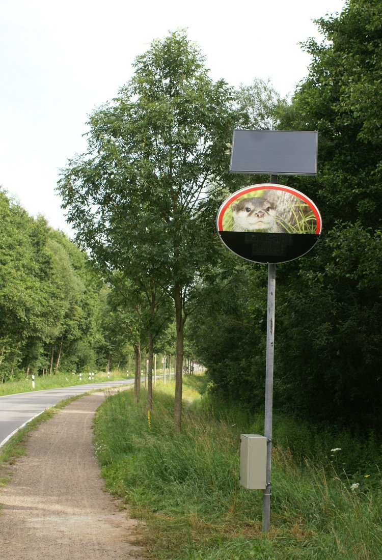 In der Zwischenzeit gab es auch eine Meldung, das Tierchen selbst sei überfahren worden. Das war aber wohl nicht bei Rothenhusen, also macht das auch nichts. Deshalb ist das Schild jetzt wieder da, in der neuesten Version. Er weiss auch, was an ihm vorbeifährt: Landmaschine, Auto oder Fahrrad. Nach wie vor mahnt er zum langsameren Fahren oder sagt freundlich "Danke!". Und natürlich führt er brav seine Statistik, wieviele Verkehrsteilnehmer zu schnell bzw. richtig langsam waren. Also, fahren Sie ordentlich, wenn Sie nach Rothenhusen wollen. Und wenn Sie an einer Schule oder einem Kindergarten vorbeifahren, denken Sie daran, wieviel sinnvoller ein solches Schild an solchen Orten wäre, und fahren Sie dabei noch etwas vorsichtiger.
