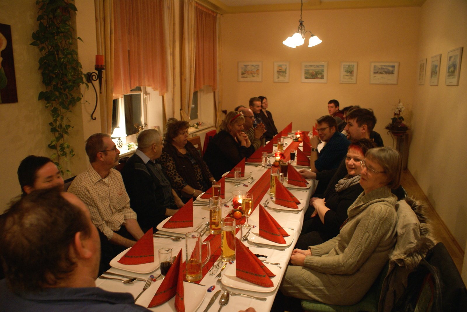 Ein wenig wehmütig begann der Abend, der sich im Verlauf der Feier zu einem ausgelassenen, frühlichem Miteinander entwickelte. Nachdem die Küche des Café Grenzstein in vollen Zügen genossen wurde, traf der Weihnachtsmann mit Unterstützung eines Engels ein. Dabei gab es nicht nur kleine Geschenke - vorher waren auch Gedichte gefordert, und zwar von den Kameraden und ihren Partnern. Im Anschluß daran gestaltete sich der Abend noch bis in die Nacht hinein sehr angenehm für alle, die dabei waren. Der Dank der Kameraden unserer Wehr geht an