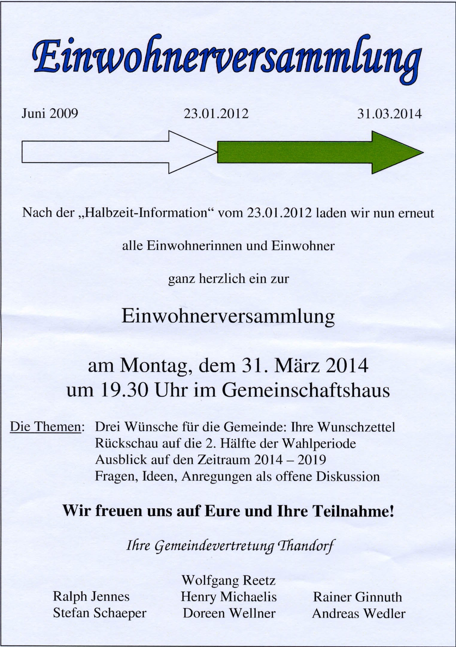 Am 23.Januar 2012 trafen sich die Einwohner und Einwohnerinnen aus Thandorf und Schlagsülsdorf, um einen Blick auf "die 1. Halbzeit" der Wahlperiode zu werfen. Damals versprachen wir, vor den Wahlen 2014 erneut zu dieser Versammlung eingeladen: Voilà, jetzt geht`s los! Inzwischen hat jeder die Einladung in seinem Briefkästen vorgefunden, natürlich hoffen wir nun auf einen vollen Saal!