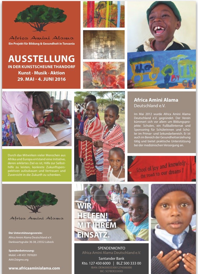 Am 29. Mai ist Eröffnung, am 4. Juni geht die Ausstellung mit einem Galeriefest zu Ende. Gezeigt werden Arbeiten von Margit Buß, Olivia Althaus-Apmann und Prof.Dr. Norbert W. Guldner, der auch Kinder in Tansania betreut hat. Einige der Werke dieser Kinder gibt es auch hier zu sehen, zur Unterstützung des Vereins Africa Amini Alama, der von Deutschland aus Sponsoring für Bildungsprojekte in Tansania ermöglicht. Musikalisch begleitet wird die Eröffnung der Austellung von der Cellistin Ulla Rönnburg v. Streit, die schon Auftritte beim Schleswig-Holstein Musikfestival und bei den Salzburger Festspielen hatte.