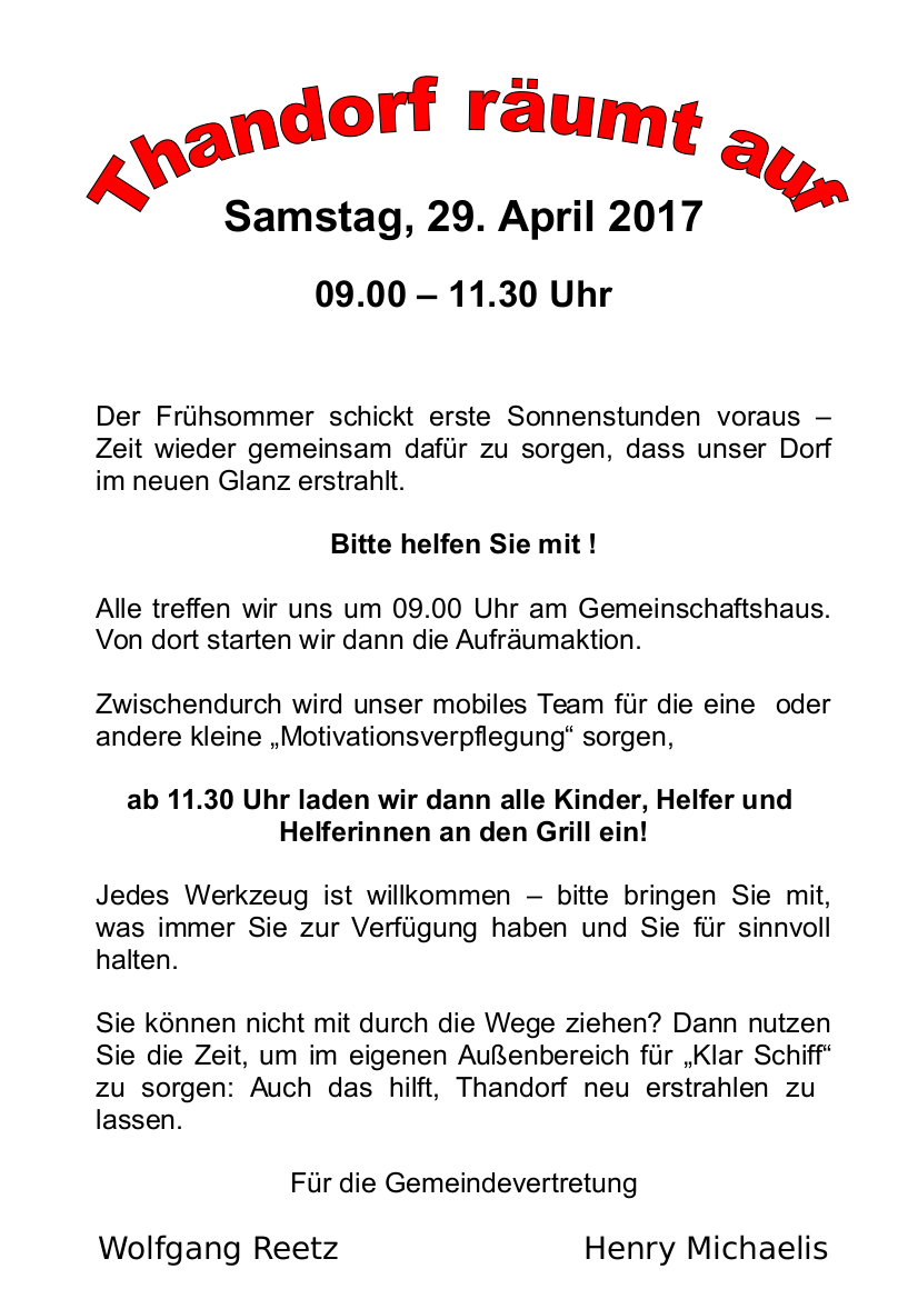 Alle treffen wir uns um am Samstag, dem 29. April 2017 um 09.00 Uhr am Gemeinschaftshaus. Von dort starten wir dann die Aufräumaktion. Zwischendurch wird unser mobiles Team für die eine oder andere kleine „Motivationsverpflegung“ sorgen, ab 11.30 Uhr laden wir dann alle Kinder, Helfer und Helferinnen an den Grill ein! Jedes Werkzeug ist willkommen – bitte bringen Sie mit, was immer Sie zur Verfügung haben und Sie für sinnvoll halten. Sie können nicht mit durch die Wege ziehen? Dann nutzen Sie die Zeit, um im eigenen Außenbereich für „Klar Schiff“ zu sorgen: Auch das hilft, Thandorf neu erstrahlen zu lassen.