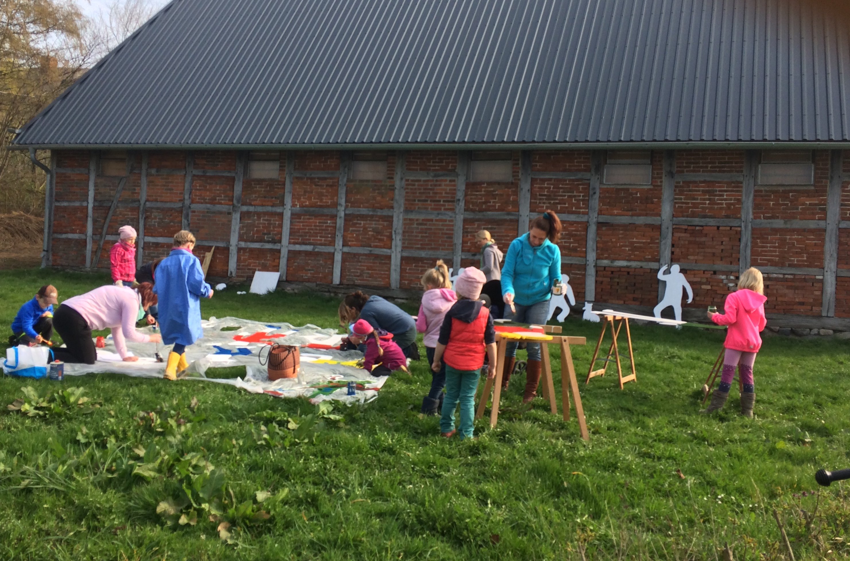 Dafür durften sich die Kinder, die heute dabei waren, auf ein großes Stück Holz legen und ihre Umrisse nachzeichnen lassen. Diese wurden dann ausgesägt und heute nun bunt angemalt.