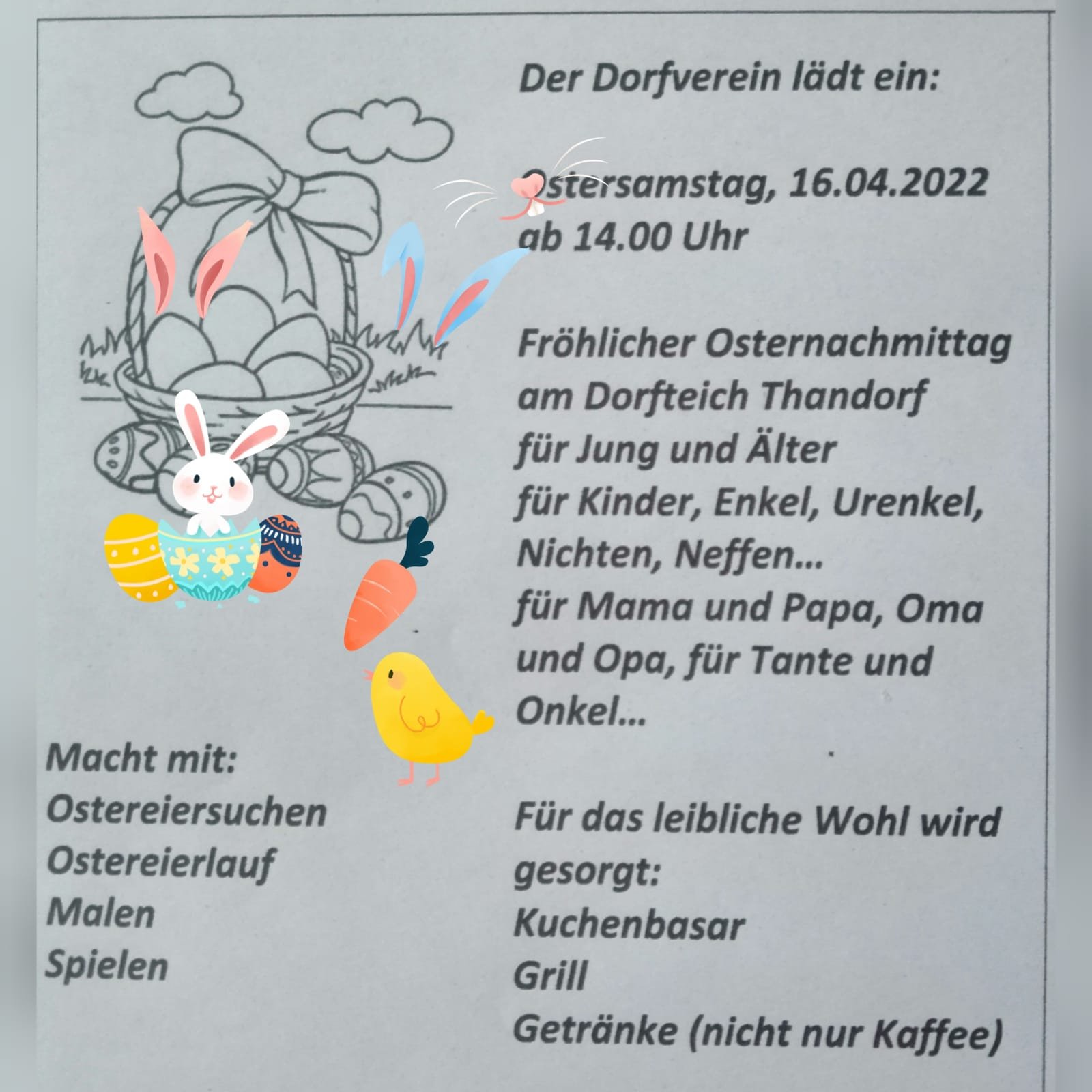 Zu einem Osternachmittag lädt der Dorfverein Thandorf e.V. am Samstag, dem 16. April ein.
