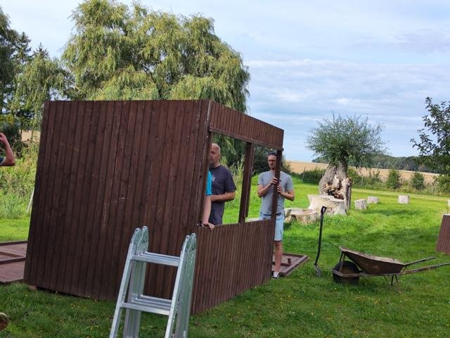 Am Sonntag, 17.09.2023, trafen sich 15 Mitstreiter und Freunde am Dorfteich, um die vom Amt Rehna gespendete Holzbude aufzubauen.