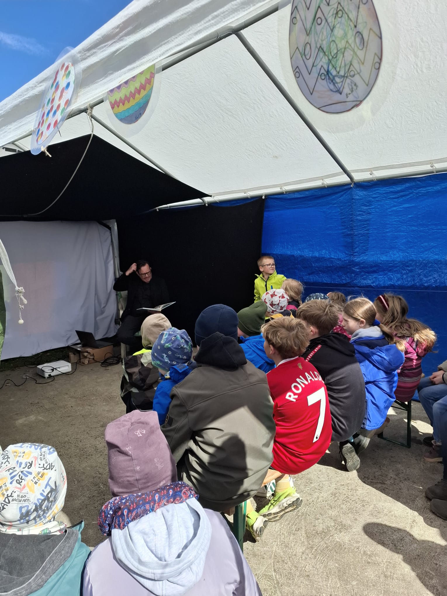 Eröffnet wurde der Nachmittag von Benjamin Kernen, auch bekannt als Captain Flint vom Piraten-Open-Air, mit launigen Ostergeschichten, denen die Kinder im extra dafür aufgestellten Zelt gespannt lauschten.