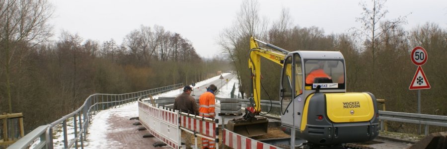 Die Temperatur liegt heute ein wenig über dem Gefrierpunkt. So konnten die Baumaßnahmen an der Brücke über die Wakenitz bei Rothenhusen unbehindert anfangen.