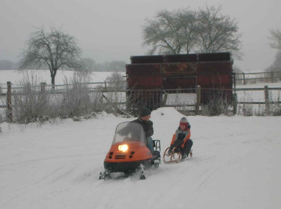 Da der Winter nun schon zum zweiten Mal in dieser Saison ausreichend Schnee liefert, gibt es für die kleinen und größeren Kinder in der Gemeinde ein besonders Vergnügen: mit dem Motorschlitten über die Weiden. Auf manchen haben die Besitzer es erlaubt, und der Bürgermeister hat auch sicher nichts dagegen...