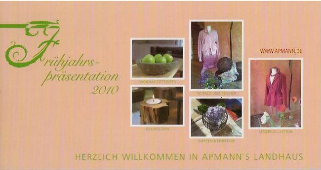 Vom 8. bis 23. April 2010 findet in diesem Frühjahr wieder die Mode - und Accessoire - Präsentation in Apmann´s Landhaus statt.
