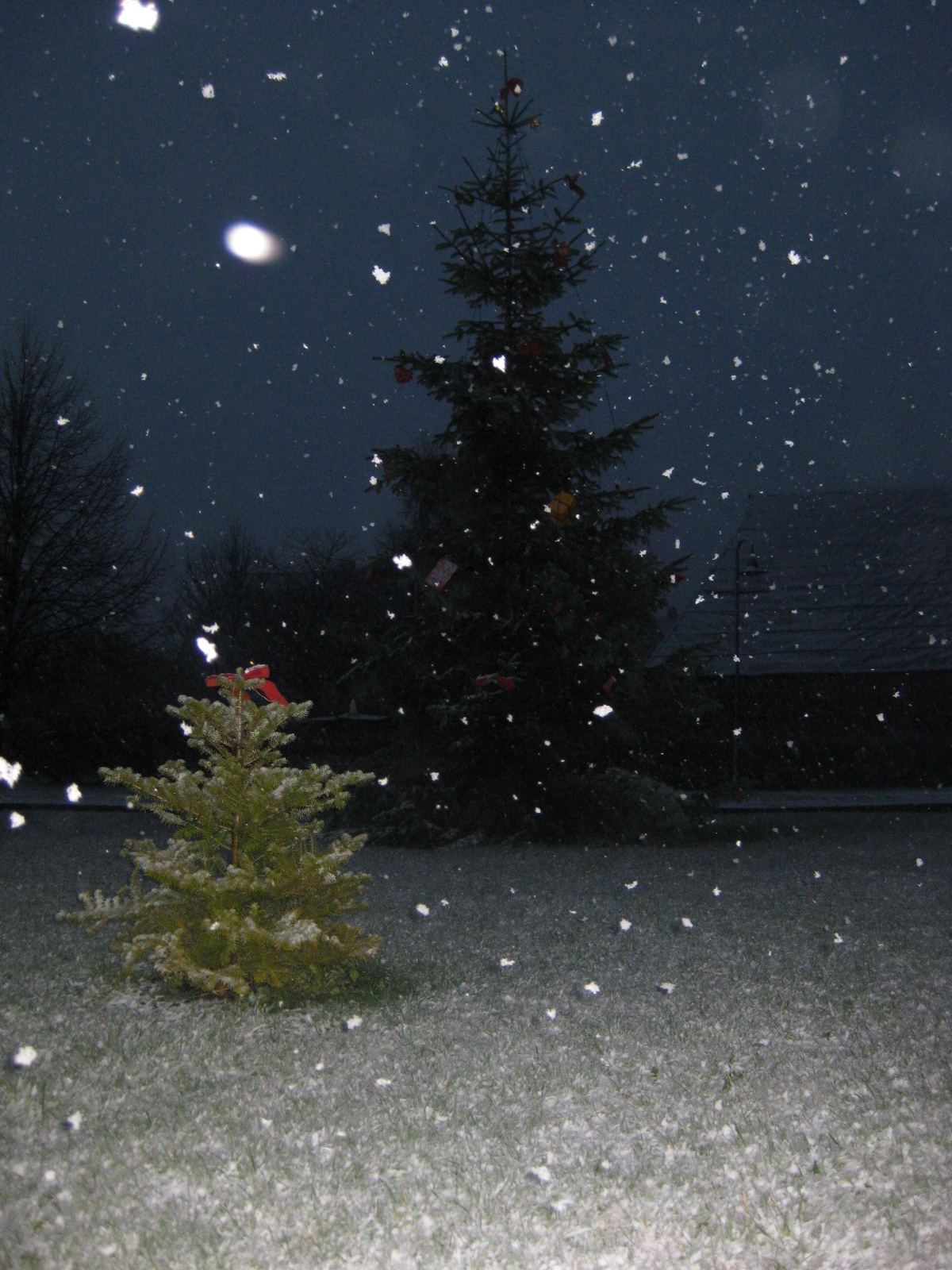 Zur Dämmerung, die Lichter des Weihnachtsbaumes waren gerade abgeschaltet, fiel der erste Schnee in großen Flocken auf die Erde. Gegen 8:40 Uhr war der Schneeschauer vorbei und ein schöner blauer Himmel zeigte sich. Ca. 5-10mm Schnee blieben bei Temperaturen um die 3°C liegen.