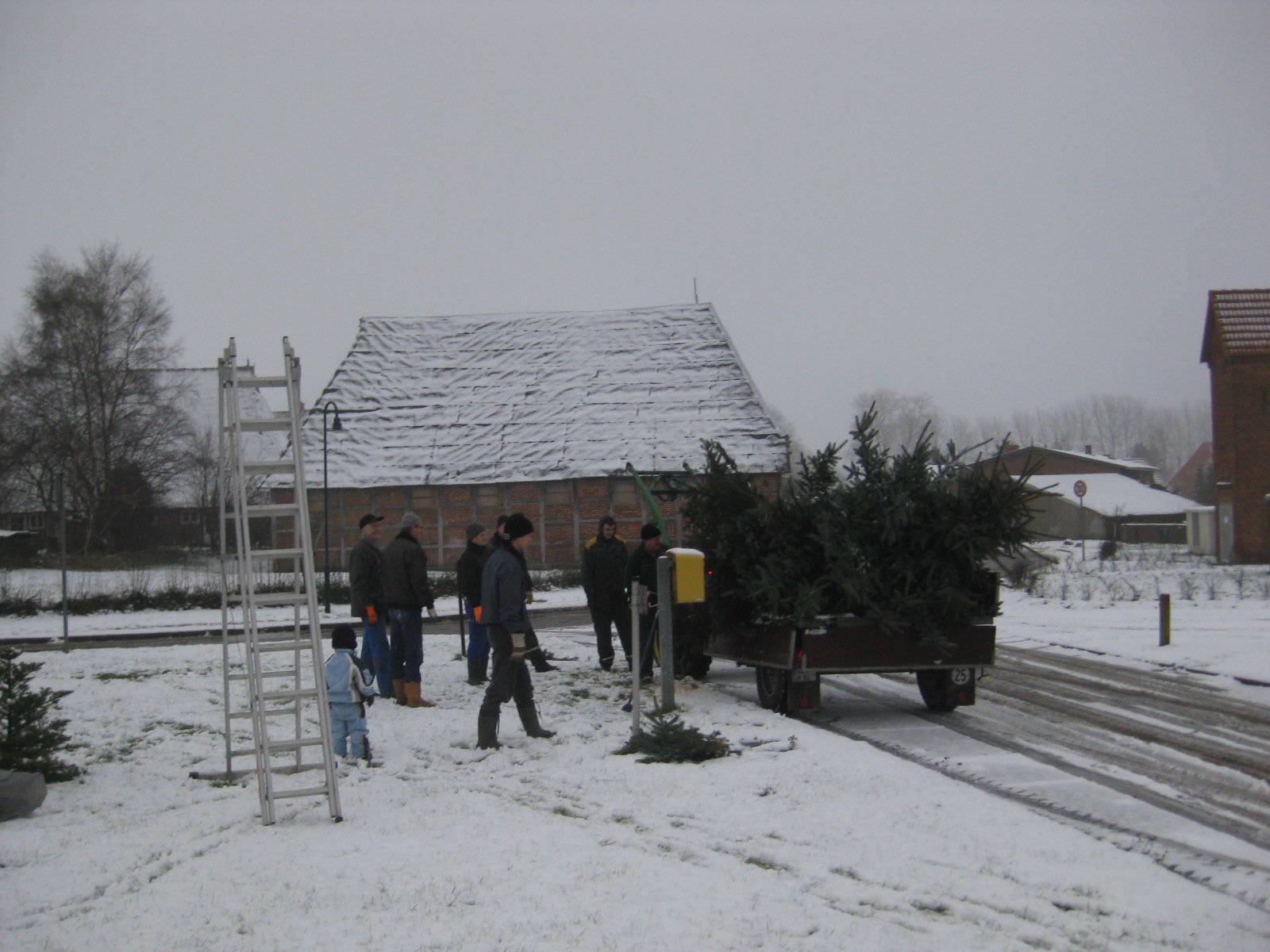 Am Vormittag stellte der Kurvenclan den Baum auf. Auch dieses Jahr wurde er von Heiligeland gesponsert. Der Baum jedoch stellte die Thandorfer vor einige Herausforderungen. Er war in sich mehrfach schief gewachsen. Jedoch konnte dies durch 2 Spanndrähte ausgerichtet werden. Mit den Lichterketten und der Dekoration schmückt er nun den Anger in Thandorf. Auch der kleine neu gepflanzte Baum bekam als Dekoration einige Strohsterne ab.