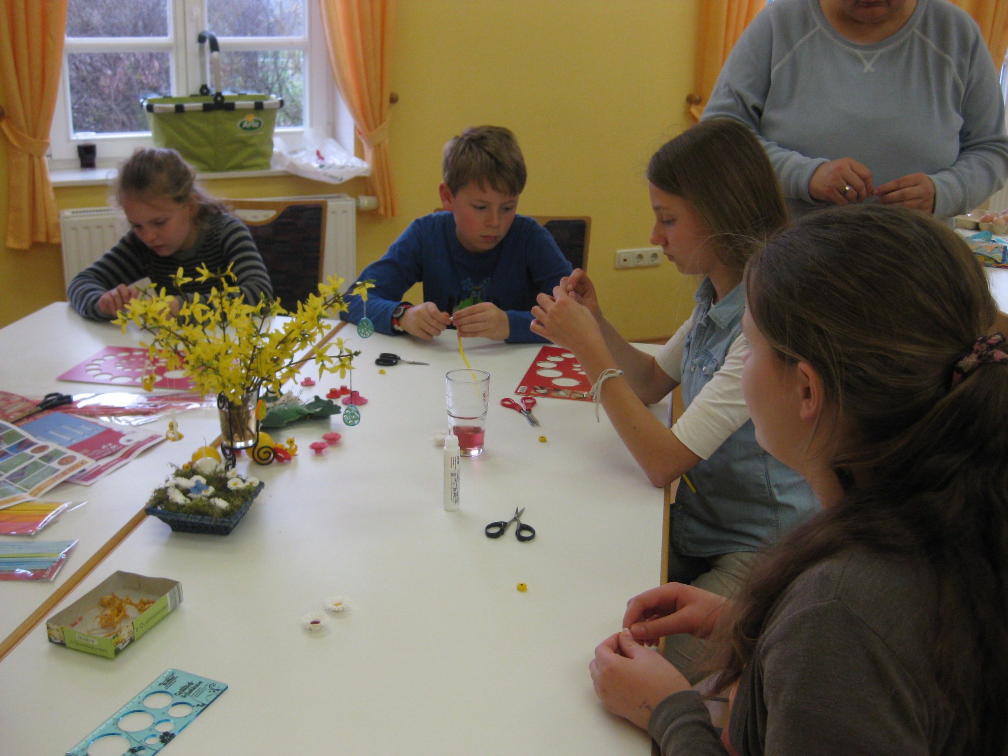 Papierblumen, Quillingenten und Osterhasen wurden individuell hergestellt. Dabei wurde der knifflige Umgang mit Schere und Kleber in allen Altersgruppen geübt. Auch die Kleinsten können mit Kleber und Glitzersteinchen schon Kunstwerke erstellen.