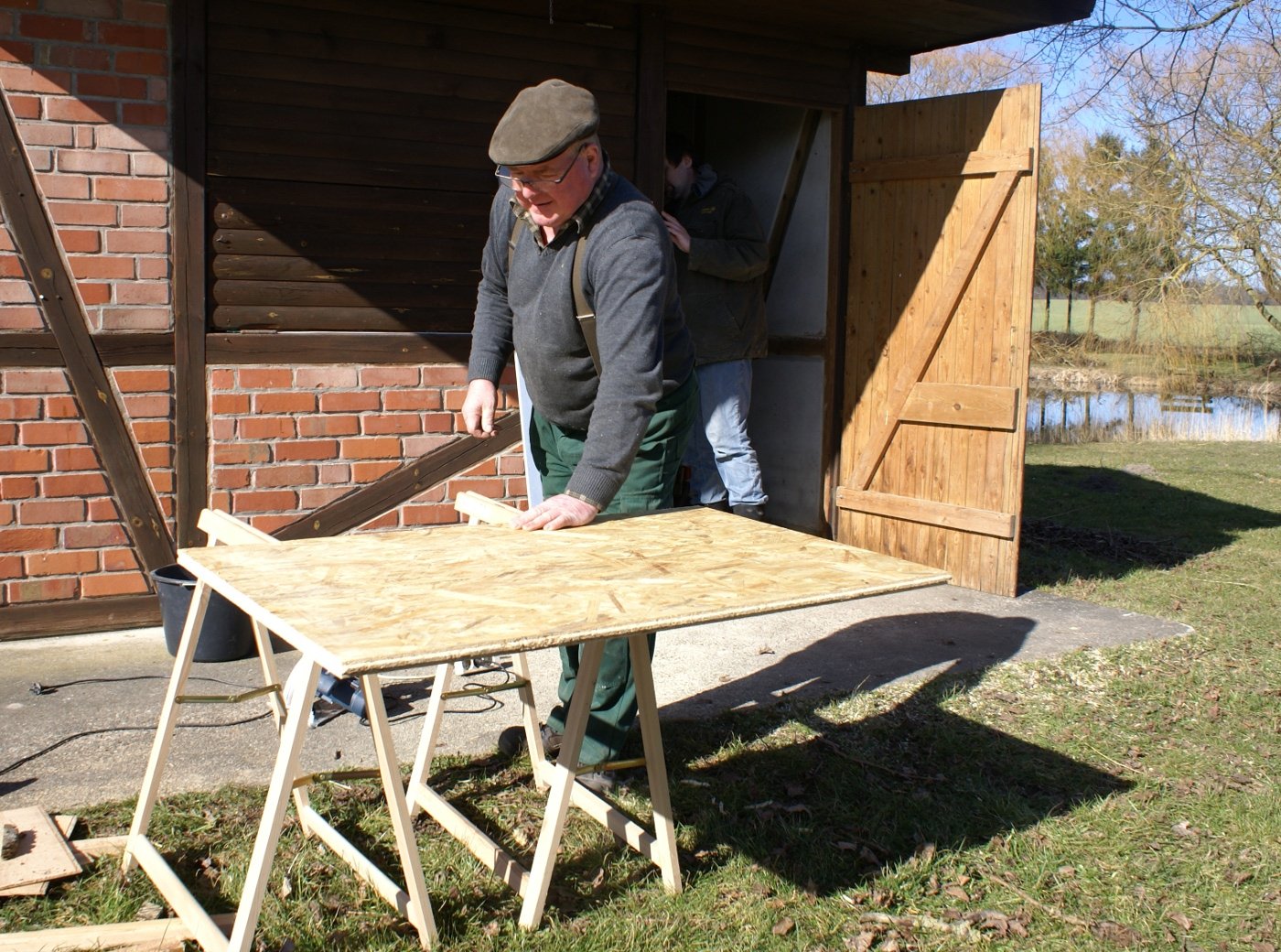 Heute war die Innenwand des Häuschens in Arbeit, nachdem am letzten Wochenende schon die alte Wand herausgenommen wurde. Hinter der jetzt neuen Wand erhält ein Umkleideraum eine Sitzbank. Auch der Fußboden erhält noch einen neuen Belag. Hinter dem Tresen soll eine breite Arbeitsplatte Platz bieten für all die Tätigkeiten, die beim Oster- und Herbstfeuer und beim Teichfest anstehen. Bis zum Osterfeuer sollen die Arbeiten abgeschlossen sein.