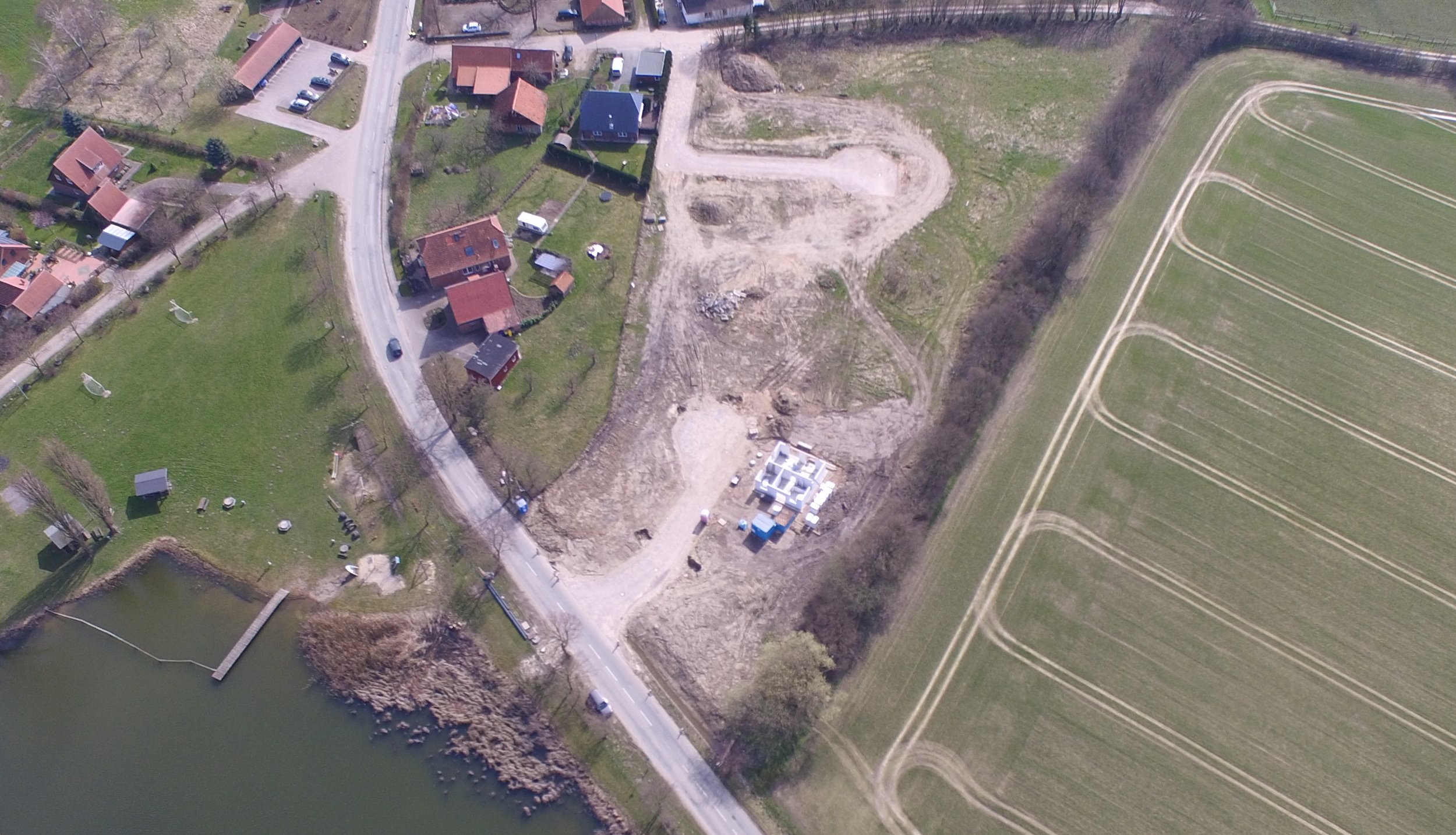 Die Auffahrten zum Lunken Kamp und zum Schmiedeweg sind mittlerweile fertig gepflastert, die Grundstücke dort sind erschlossen. Am Lunken Kamp entsteht bereits das erste neue Eigenheim, gut sichtbar von der Alten Dorfstraße aus. Am ehemaligen Neubau sind wie geplant fünf Grundstücke entstanden mit Größen von 1138m² bis 1553 m². Die Erschließungsarbeiten sind so gut wie abgeschlossen. Die Versorgungsleitungen wurden zwischenzeitlich von den Grundstücken herunter in das Bankett der Straße verlegt, die Schmutzwasserhausanschlüsse sind auf die Grundstücke vorgestreckt. Bis zum 15. April sollen Käufer für die Grundstücke nach Möglichkeit gefunden sein.