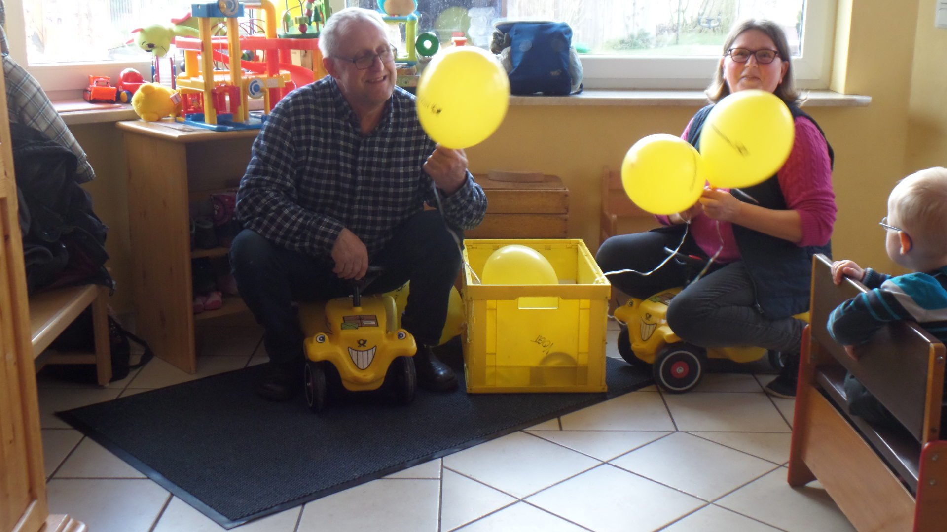 Und weil den Thandorfern ihr Nachwuchs wichtig ist, spendeten aus Anlaß des Festes die Deutsche Post und die Gemeinde Thandorf jeweils € 192,17 an die Kindertagesstätte sowie die Tagesmutter Marlies Grollmuß in Schlagsdorf. Zwei gelbe Post-Bobbycars, Spielzeug und den Geldbetrag haben Anja Schaeper und Hans Vogt vom Dorfverein Thandorf an das Ehepaar Grollmuß übergeben.