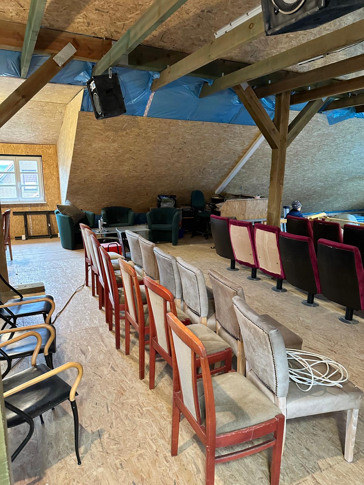 Der Clubraum bietet nach der Dämmung eine einladende Kulisse: warmes Licht und gemütliche Sitzgelegenheiten im Baustellenstil. Wir möchten allen danken, die zum Gelingen beigetragen haben – von den Handwerkern über die Helferkreise bis hin zu denen, die den Dorfverein auch finanziell unterstützt haben, um den Clubraum zu diesem Etappenziel zu verhelfen.