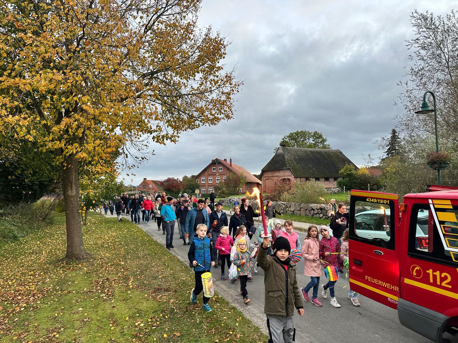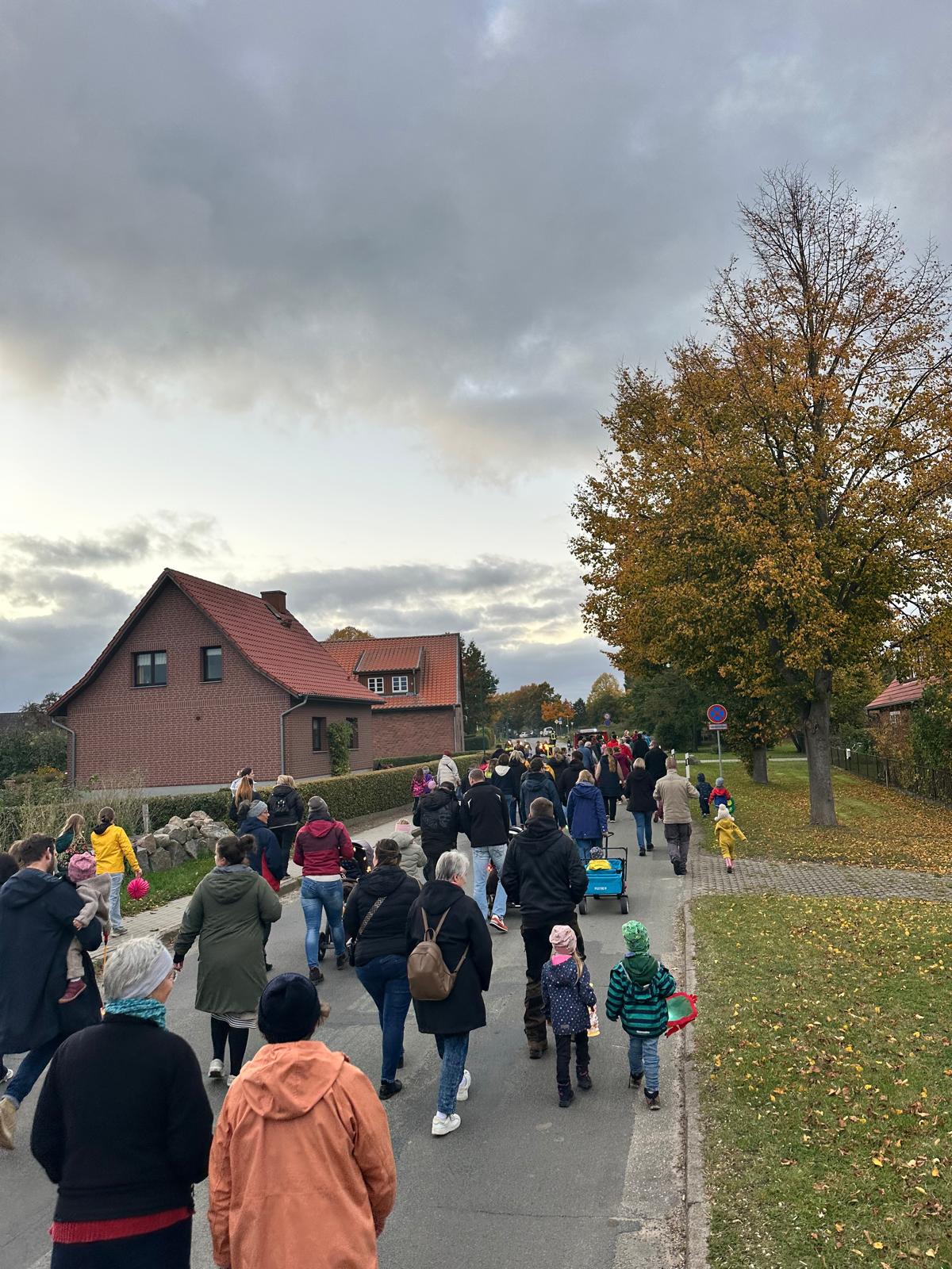 Der Laternenumzug, begleitet von fröhlichen Liedern, führte einmal durch Thandorf zum Bauernteich. Die Kinder liefen begeistert voraus, während die warmen Lichter der Laternen in der Dunkelheit funkelten.